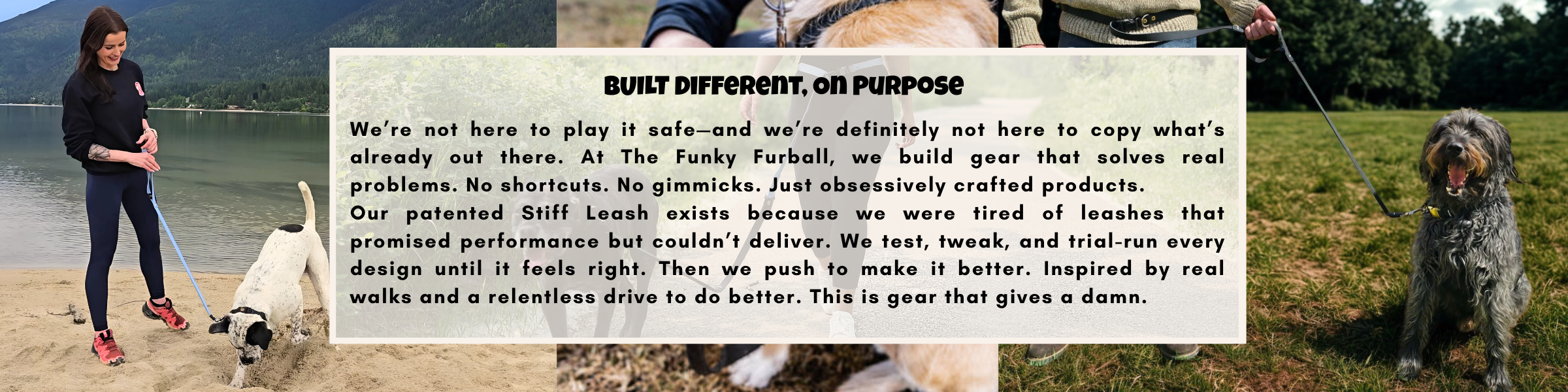 We’re not here to play it safe—and we’re definitely not here to copy what’s already out there. At The Funky Furball, we build gear that solves real problems. No shortcuts. No gimmicks. Just obsessively crafted products. Our patented Stiff Leash exists because we were tired of leashes that promised performance but couldn’t deliver. We test, tweak, and trial-run every design until it feels right. Then we push to make it better. Inspired by real walks and a relentless drive to do better. This is gear that gives a damn.